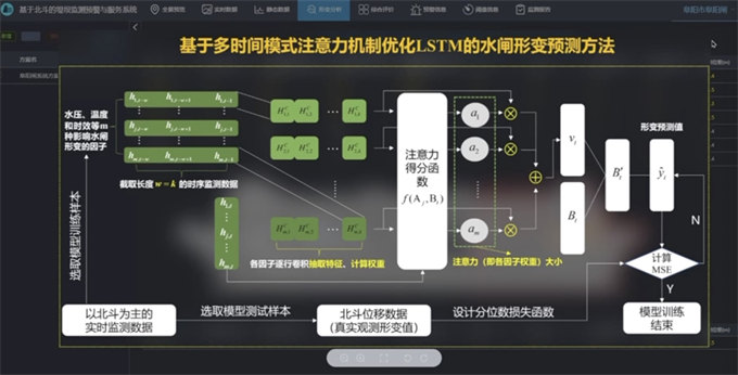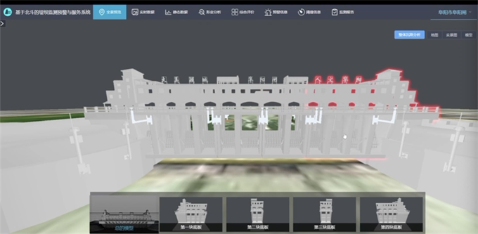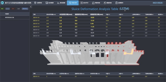 在软件设计方面,结合2018版《水闸安全监测技术规范》的要求,并且融入了特色的功能,软件采用数字孪生技术,将阜阳闸、翼墙和监测设备进行独立建模,再将监测设备叠加到被测物上,支持现场监测数据的查看,软件依据底板情况将阜阳闸模型分为4个部分,可单独对每个部分的闸门、闸墩和底板进行独立的数据展示,判断其不均匀的沉降。系统软件具有形变分析模块,采用了自主研制的LSTM的水闸形变预测方法,通过形变量分析得到水压形变、温度形变和时效形变分量,并可预测出未来三天的形变总量,该预测算法准确率达到90%以上,另外综合评价模块综合了水闸形变的五大要素,采用雷达图的方式评价水闸整体安全状态。